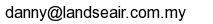 Visit Our Website @ www.landseair.com.my Company Particular| Company : | LANDSEAIR LOGISTICS SERVICES SDN. BHD. | | Fax : | 607 - 2525 835 | | Address : | No. 27A2, Business Centre, Jalan Bandar, 81700 Pasir Gudang, Johor, Malaysia | | Email : |  | | Website : | http://landseair.plansbiz.net |